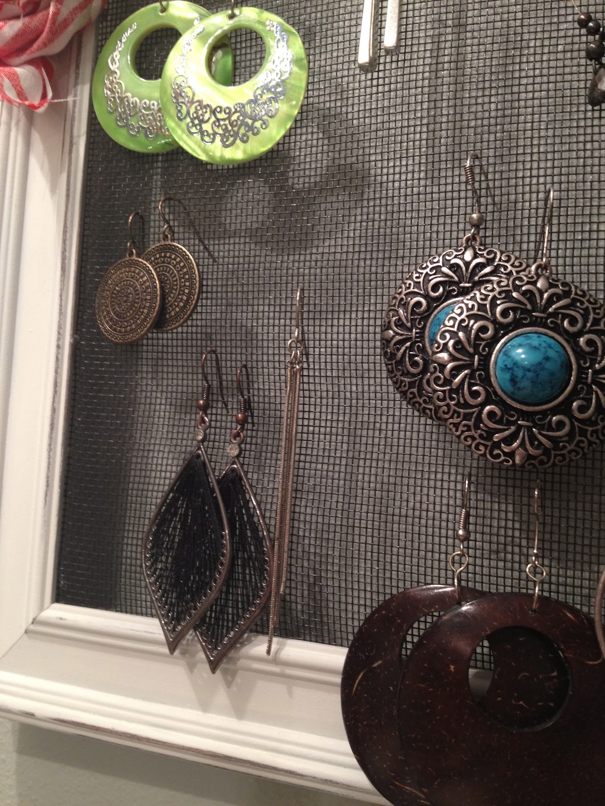Funny story: While I was putting the earrings on the frame I realized I lost one of my favorites (the long skinny one below). I looked and looked and couldn't find it anywhere. I told my husband and he said, "You lost an earring while making an earring organizer so you don't loose your earrings?" We laughed about it for a while. Luckily later I found the earring in the carpet!!