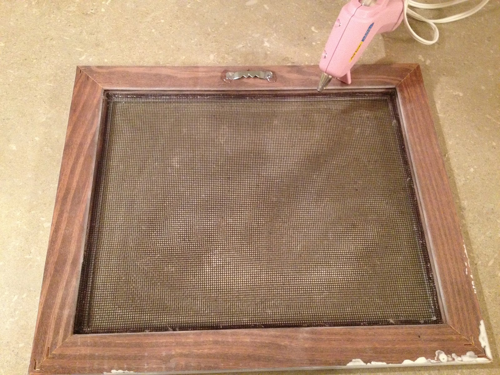 I thought about stapling the screen to the frame, but that seemed like too much work, so I pulled out my handy-dandy glue gun. I used the glass to measure the screen and then put a layer of glue around the edge and pushed the screen into place and then put another layer of glue on top.