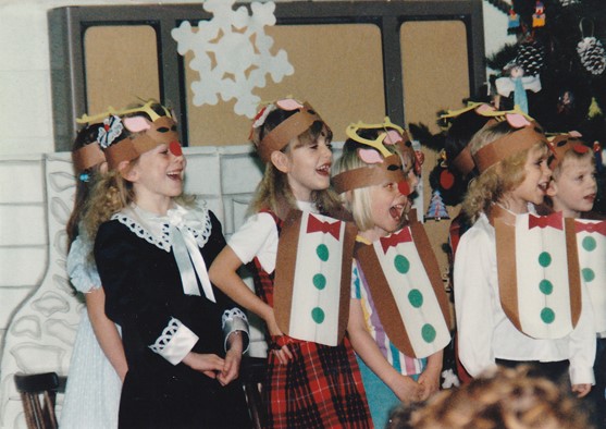 Here we are in the 1st or 2nd grade Christmas program. I'm the ridiculous reindeer in the red (check out that awesome crimped hair), and Erin is right next to me looking so cute in the black dress. One of our favorite memories is when I got caught cheating on our spelling test in first grade, yep.