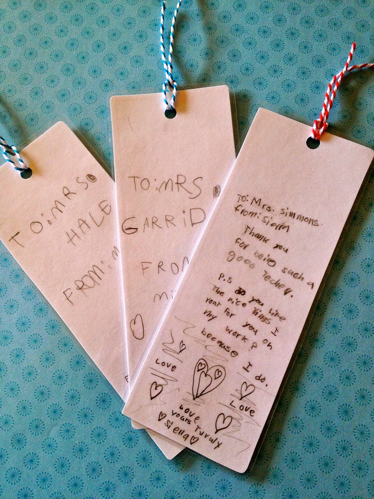 My kids wrote notes to their teachers on the back and then I laminated them.