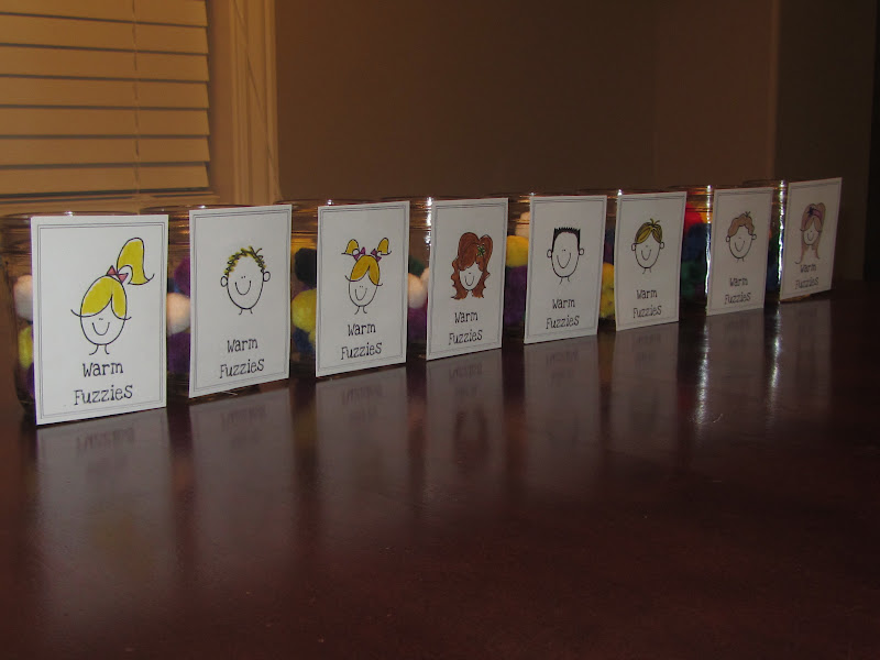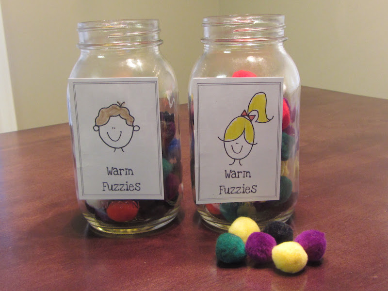 I actually like the warm fuzzies jars more than the sticker chart because the "chore" doesn't have to be on the list. Through out the day I can say, "Whoever picks up all these blocks in under 5 seconds gets 2 warm fuzzies." And once again our little boy will do anything for a warm fuzzie!