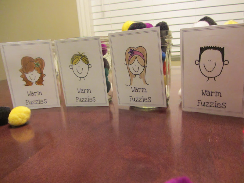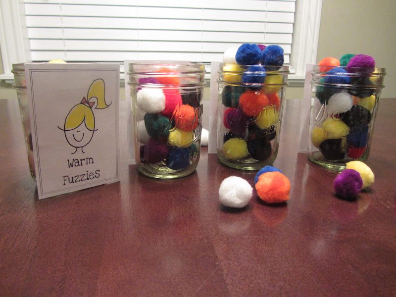 What are warm fuzzies? They're technically pom poms you can purchase at a craft store or walmart inside a large mason jar. We call them warm fuzzies because they are good acts performed during the day that hopefully make my children feel all warm and fuzzie inside.
